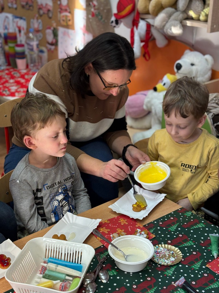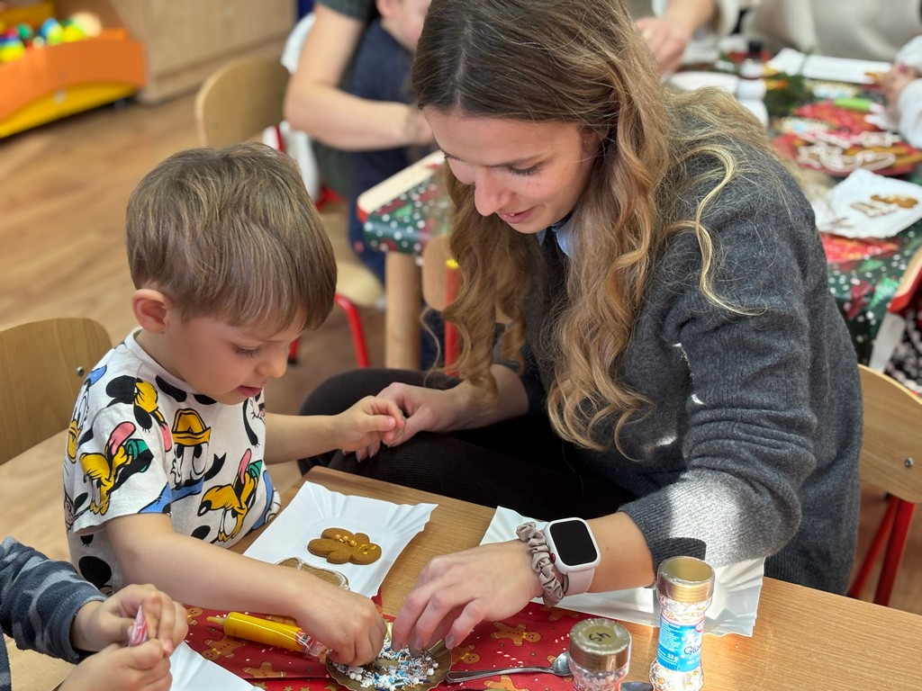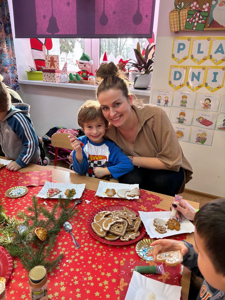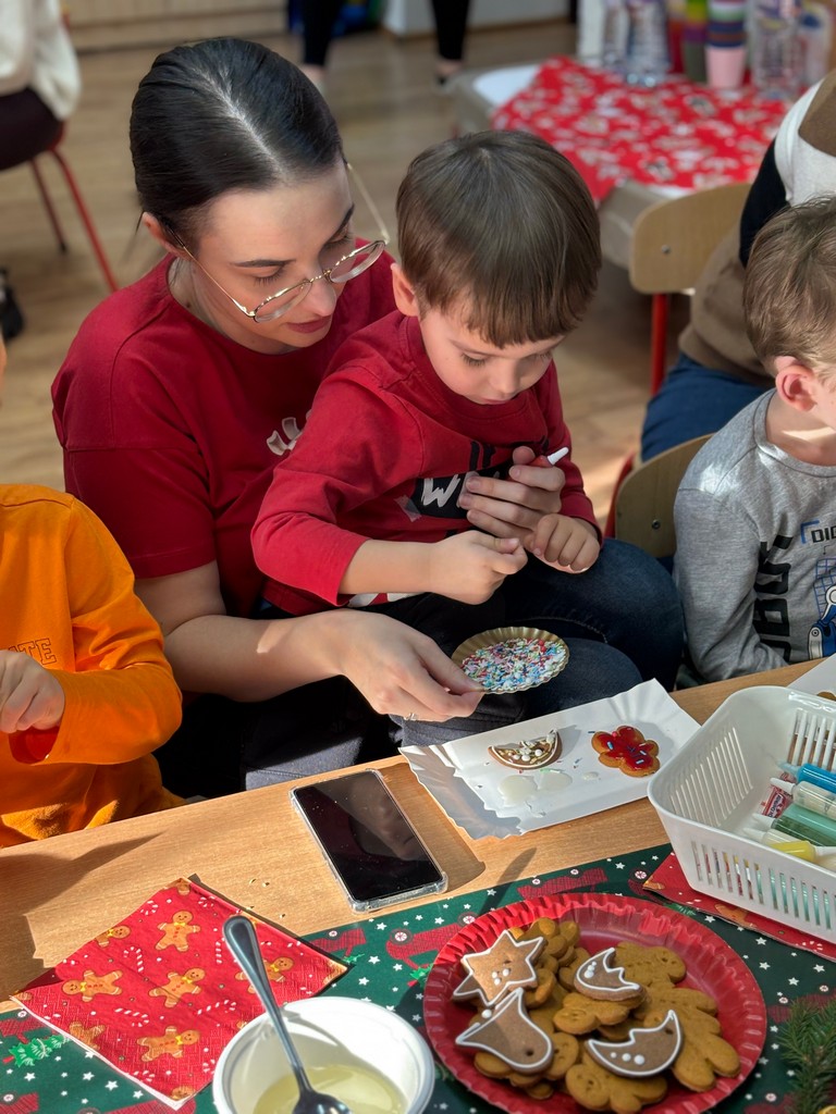 W grupie maluchów odbyły się pełne aromatu i radości świąteczne warsztaty ozdabiania pierniczków z udziałem rodziców. Dzieci wraz z bliskimi tworzyły kolorowe i pachnące świąteczne ciasteczka, dekorując je lukrem, posypkami i różnorodnymi ozdobami.