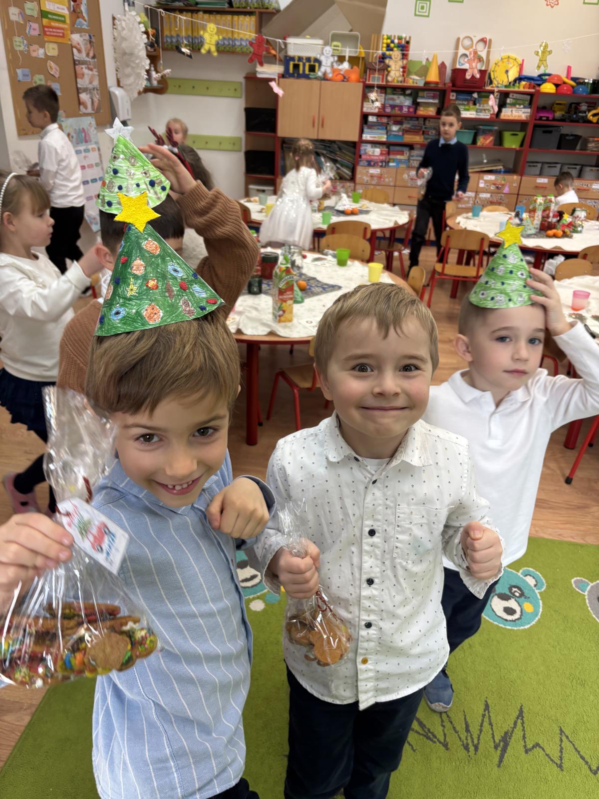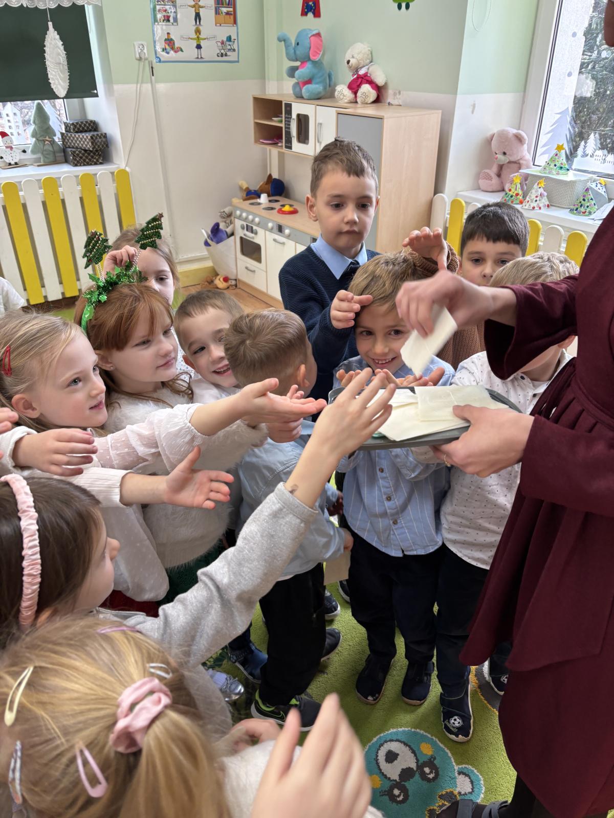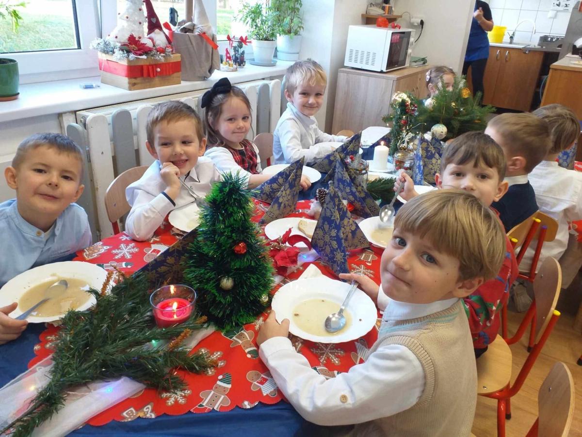 Po jasełkach odbyła się przedszkolna Wigilia. Przy wspólnym stole, w ciepłej i rodzinnej atmosferze, dzieci składały sobie życzenia, dzieliły się opłatkiem oraz wspólnie kolędowały. Był to wyjątkowy czas pełen uśmiechu, życzliwości i wzajemnej bliskości.